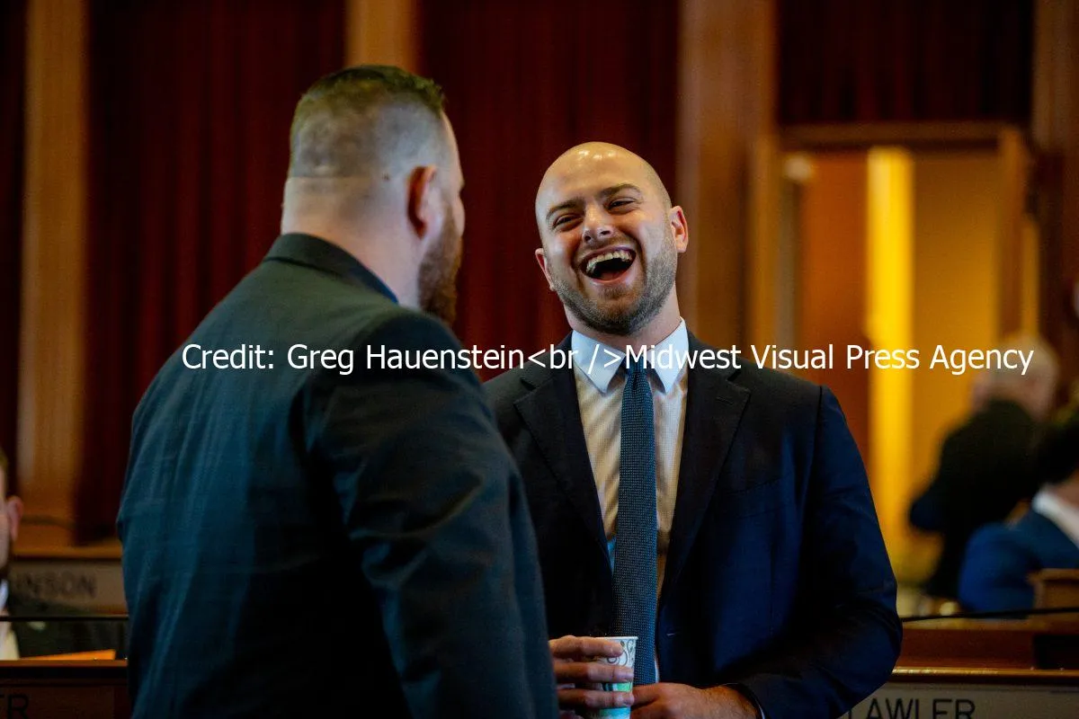 Rep. Sami Scheetz (D-Linn) laughs as he speaks with a colleague.